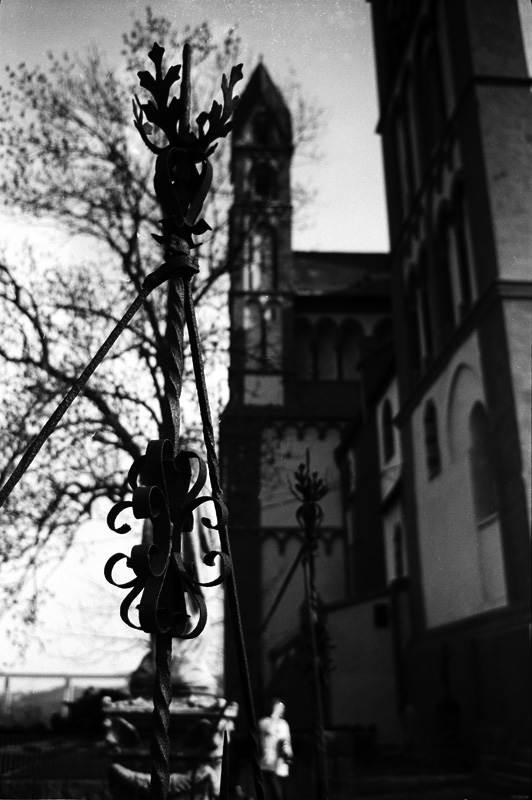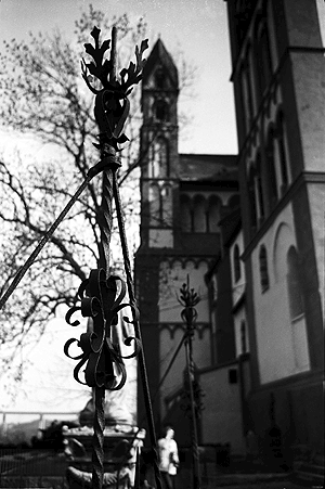 Schwarzweiß-Aufnahme einer Schmiedearbeit vor der Nordfassade des Limburger Doms.